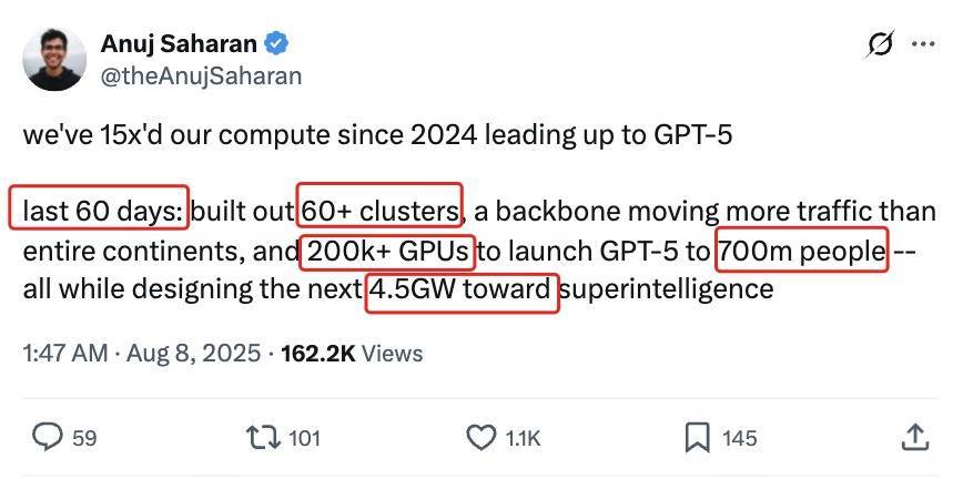 上个月刚刚降世的GPT-5背后也是巨量算力投资。OpenAI研究员Anuj Saharan在社交媒体X上说:“自2024年开始研发GPT-5以来,我们的计算能力已增长了15倍。过去60天里,我们构建了60多个集群、传输流量超过整个美国大陆的主干网以及20万多块GPU,以便将GPT-5推向7亿人——同时设计下一个4.5GW超级智能(中心)。”近期,OpenAI又被曝出计划在印度建设至少1GW规模的数据中心,以推动其Stargate(星际之门)项目扩张。近期,OpenAI也被曝出计划在印度建设至少1GW规模的数据中心,以推动其Stargate(星际之门)项目扩张。